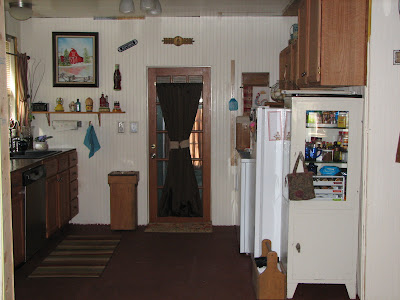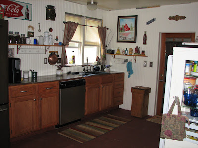 I had done the stark white kitchen with everything behind a closed door. With the forced remodel of this kitchen and the new open space I now have the room to leave things on the counter. We still have to finish the ceiling, trim molding and eventually a floor, but for now my fake counter, painted subfloor and so-so color scheme will do well.