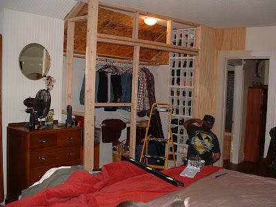 To refresh your memory the closets in the master bedroom had to be ripped out way back when due to the mold problems.  This was no big loss as they had been installed on either side of the chimney that runs up the center of the back wall and were only 2 foot wide with teeny tiny doors.  We thought long and hard on this one.  We wanted to make a walk in closet with plenty of storage.  Well we succeeded.  There are 5 built-in shoe racks, a dual rod for 8 feet and 3 feet of space for extra long garments like dresses.