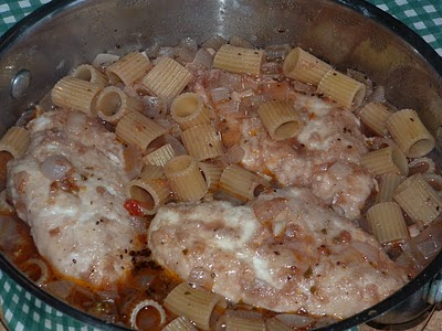 Dissolve the tomato paste into the wine and chicken broth. Sift together the flour, salt and pepper. Dredge the chicken breasts in the flour mixture. Heat the butter and oil in a large skillet over a medium-high heat. Brown chicken, turning regularly until browned on both sides, for 5-10 minutes. Add the onion and garlic while browning the chicken. Add the remaining ingredients. Simmer, stirring occasionally until chicken is cooked through and sauce is thickened. Serve over prepared pasta**.
