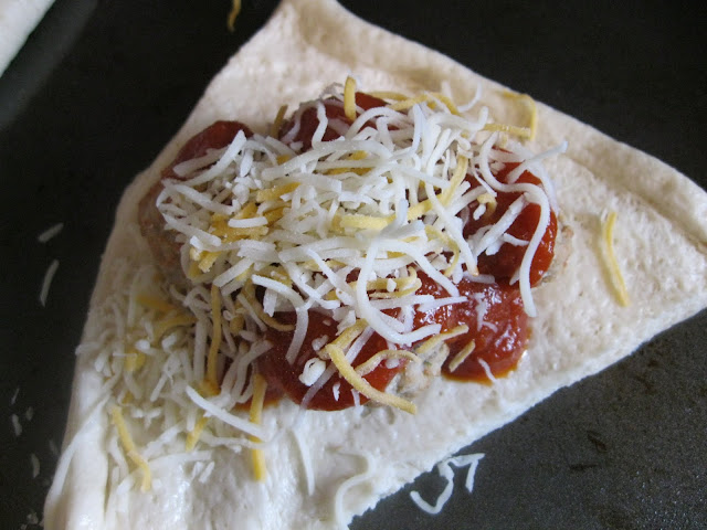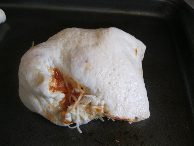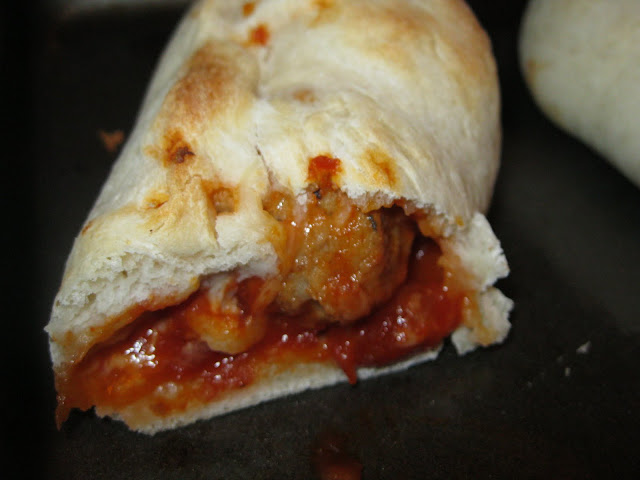 Directions: Preheat oven according to pizza dough package. Cut the pizza dough into large enough pieces so that they can be folded over. Place meatballs on dough, cover with spaghetti sauce and cheese. Fold dough over to create pockets. Cook according to pizza dough directions.