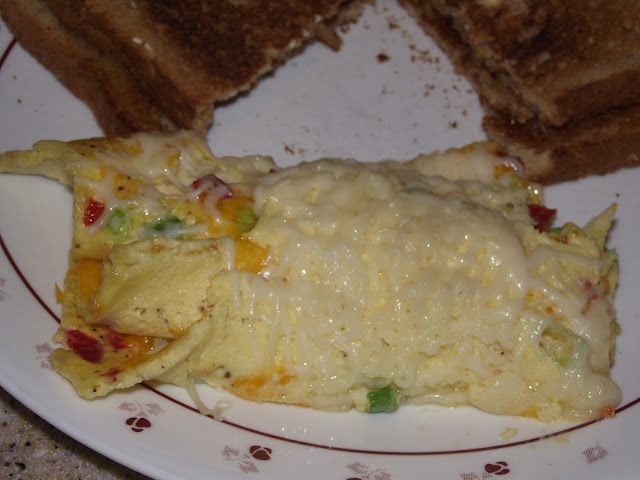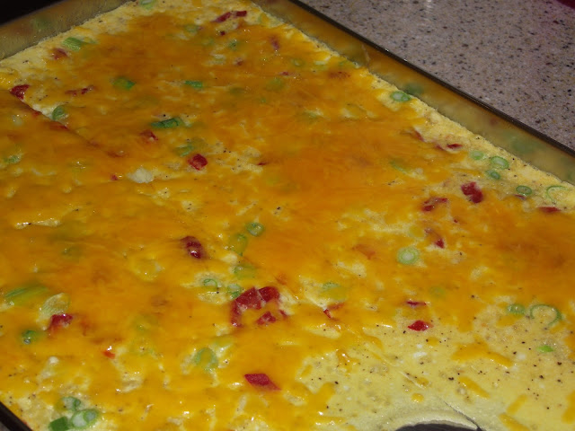 • In a large bowl, whisk together the eggs, milk, hot sauce, flour, ham, onions, peppers, mushrooms, salt and pepper.