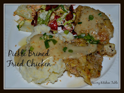 - Remove chicken from brine, scraping off chunks of relish. Chill until ready to fry.
