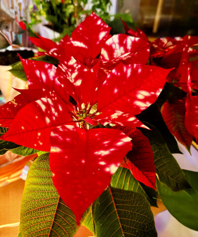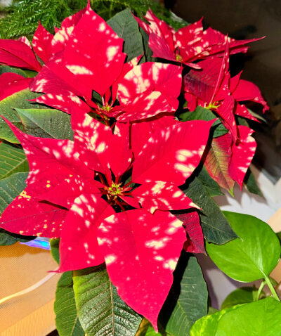 My neighbor popped over yesterday with this surprise Poinsettia. She said it reminded her of me with the unique variegated pattern. I LOVE how the scentsy candle light gives it a beautiful glow.