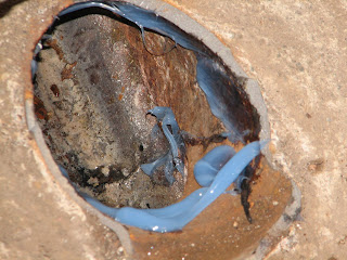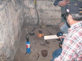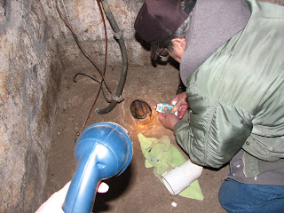 The Basement drain clean out: This is one of the items the previous owner was supposed to take care of, but failed to do. At some point someone couldn’t get the plug off and they broke a hole into the rear of the pipe. So we hired a plumber to give us a hand. He melted out the old lead and was able to break off the old cap. The inside was then cleaned out and a new PVC pipe and cap were glued together and sealed in place to prevent further sewer gas from escaping.