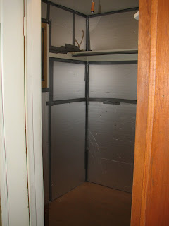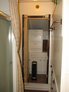 The Downstairs Bathroom: The first part of this bathroom was here. Today we finished the down stairs bathroom. It had been a butler’s pantry originally and a cold storage room. We finally finished converting the cold storage part into a set of cabinets and finished the molding and paint.