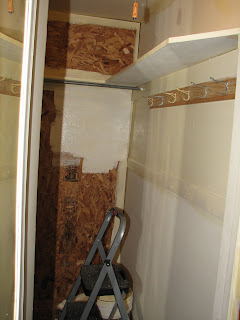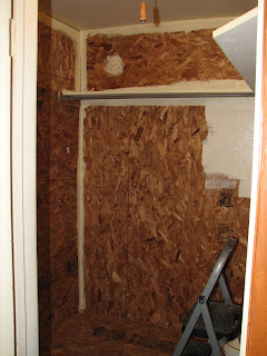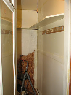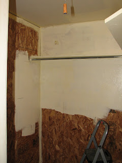 Hubby has finished the trim molding and the door for the attic since I took this next picture. We’re in the process of the final coat of paint as we speak. Other than removing the old claw foot tub and changing it to the corner shower we tried to keep it in character for the age of the house by using the bead board, decorative ceiling tiles and old fashioned rounded sink.