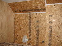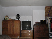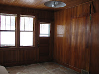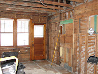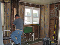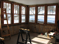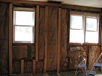 The next 2 pictures are the gutted sun porch where we found their roof leak (another thing they failed to disclose ~ thank God for neighbors who pay attention) due to missing roof pieces, disentegrated old rock wool insulation and ceiling joists that were worthless since they were all sistered and sagging. Not one of them went all the way across to support anything. So we took this opportunity to bring it to code and safety standards.