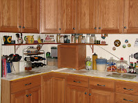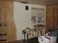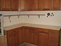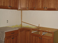Anyway, I digress. Back to the kitchen… the cupboards are new, but we’re installing wainscotting board between the upper and lower cabinets to try and give it that “Walton’s” feel. The ceiling is several inches higher than a standard ceiling of today so that gives us a better canvas to work with in creating a spacious work area. We want to do some type of tin ceiling and probably an oak plank floor, but for today we accomplished some of the wainscotting and it is beginning to feel like the home we thought we bought.