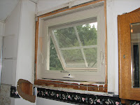 The house came with a really small kitchen to begin with and then when we were forced to tear it all out because of the mold, it only seemed logical since we were going to already have a mess to open the wall between the old kitchen and sun porch (which was really a 3 season porch with no floor on top of the slab or decent insulation) and make a large family style kitchen eliminating the separate sun porch. We also decided to make life easier and bring the washer and dryer up into the new kitchen and out of the basement area (It was so cold doing laundry last winter). The dryer is upstairs now, but I can’t wait until the washer joins it (oh my aching back lugging the wet laundry upstairs)! I was so excited about having all the windows in my new kitchen.