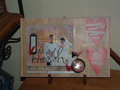 I originally found Catherine at Art from the Heart & sewing on paper during OWOH One World, One Heart), but immediately fell in love with her work. I purchased this piece from her ETSY shop and it’s already here and even better in person! Many of you know, but most don’t that I have a penchant for weddings and sentimental images of weddings. Hubby and I are finally having our “Happily Ever After Fairy Tale Ending”, but it was a long time coming after surfing some very rough seas and we take it very seriously. So, this piece that Catherine crafted is very special to us and it was just in time for Valentines Day!