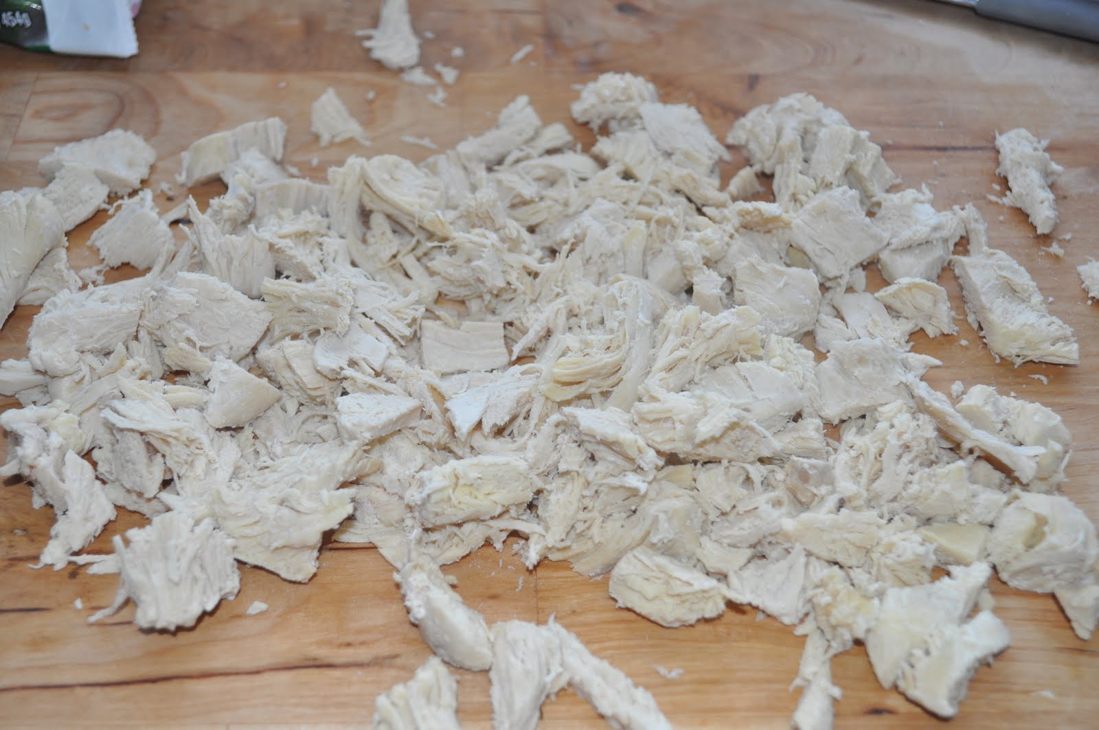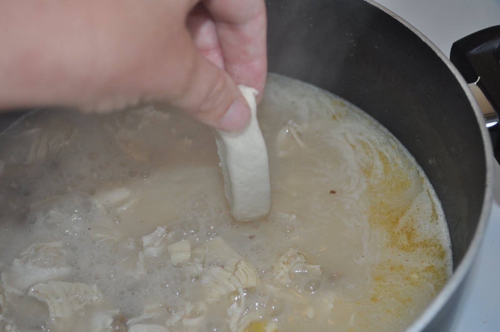- While the chicken is boiling in the stock, throw some flour down on the cutting board. Open the biscuits and pad them down until they were about 1/8 inch and then cut them into 1/2 inch strips.