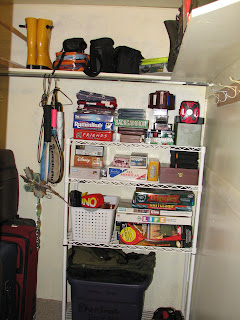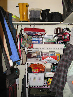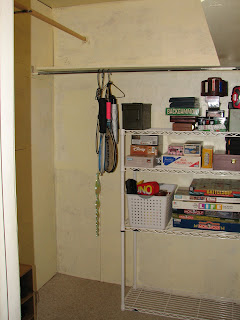 The coat closet: I love this closet. It’s 6×6 feet and well located. It turns out though that it wasn’t original to the house. It was added on at some point using a portion of the front porch. Which is great, but it was never insulated, walls or floor, so we started by insulating the walls and floor and then building new walls and floor over the insulation. I wish I had a before picture, but oh well. It also had a single paned window. Who puts a window in a closet? So we eliminated the window, changed the direction of the clothes rod and built in a shoe rack for all the winter boots. Hubby added hooks for the frequently worn jackets. We also added a great rack for all the games so they are easily accessible and there is room for all the luggage too. Then I painted it the Oklahoma Wheat color and Voile we have an insulated Mud room.