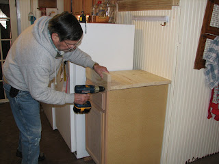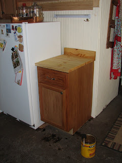 The kitchen cabinets & counter tops: We installed the last cabinet and its counter top. Then I stained the cabinet and sealed the counter top.