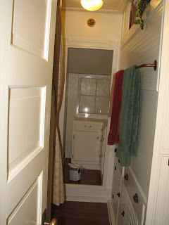 The Downstairs Bathroom: The first part of this bathroom was here. Today we finished the down stairs bathroom. It had been a butler’s pantry originally and a cold storage room. We finally finished converting the cold storage part into a set of cabinets and finished the molding and paint.