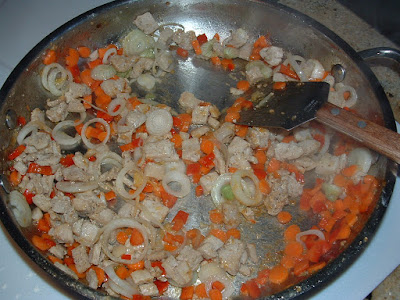 A few tablespoons of pasta, about 1/4th of the cheese mixture in each of the two peppers, the sausage, and a few tablespoons of the marinara sauce. Feel free to use your favorite marinara or jarred marinara. I made a quick one.