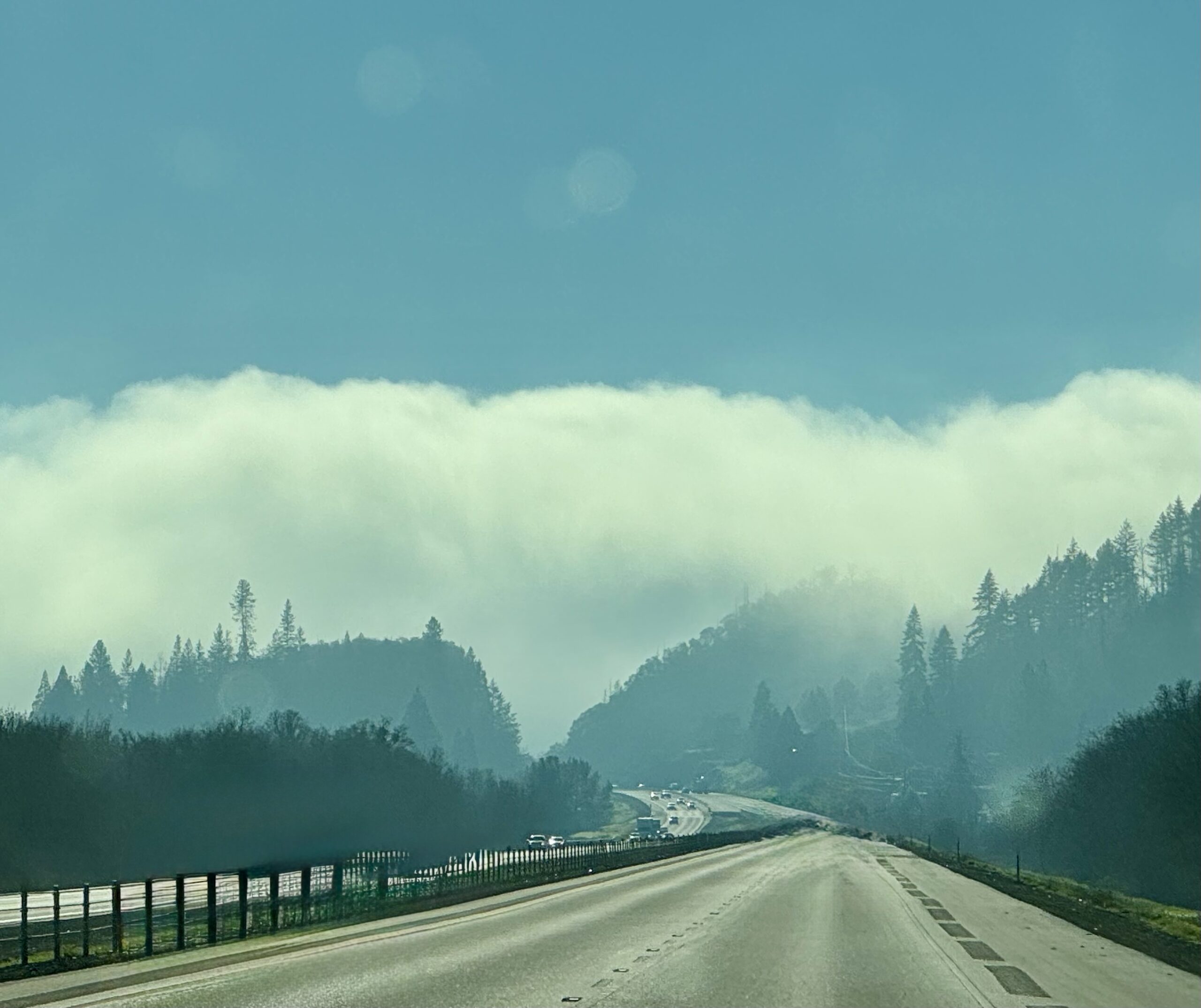 The strawberry Hummingbird cake was a HUGE hit on Friday night and the FREEZING FOG was beautiful on Thursday, though it delayed many a flight and made the roads a bit treacherous in the early morning. This picture was taken late morning as it was burning off.